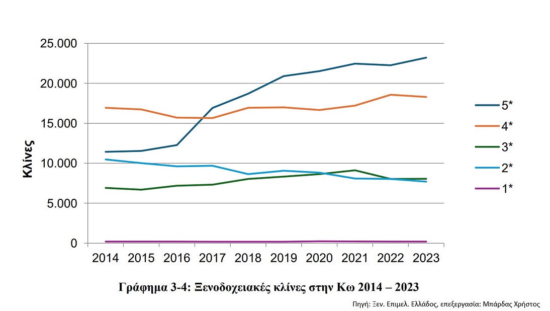 Όσον αφορά τις ξενοδοχειακές κλίνες, από 45.963 το 2014, έφτασαν τις 57.463 το 2023, αύξηση της τάξης του 25%. Ενώ, το ποσοστό είναι μικρότερο εκείνου της προειδοποίησης της μελέτης, στην πράξη τα πράγματα είναι πιο σοβαρά.